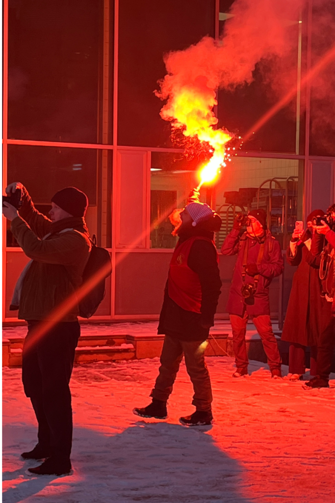 En af de fremmødte sætter kampråbene i gang, mens han holder et tændt nødblus over hovedet og forsamlingen bades i det røde lysskær.